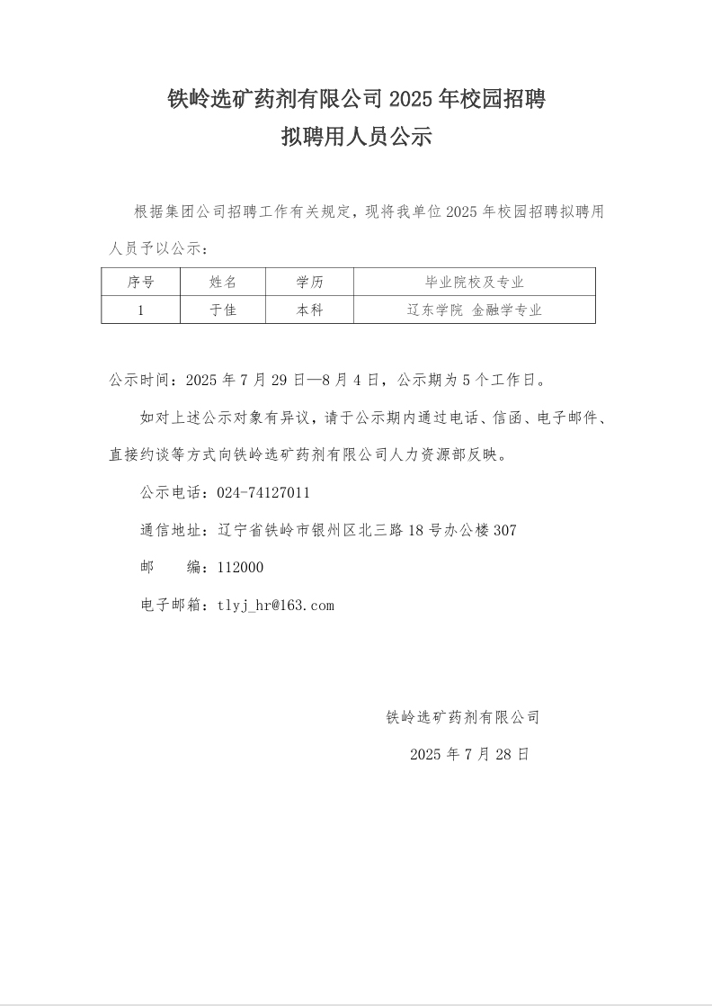 鐵嶺選礦藥劑有限公司2025年校園招聘 擬聘用人員公示