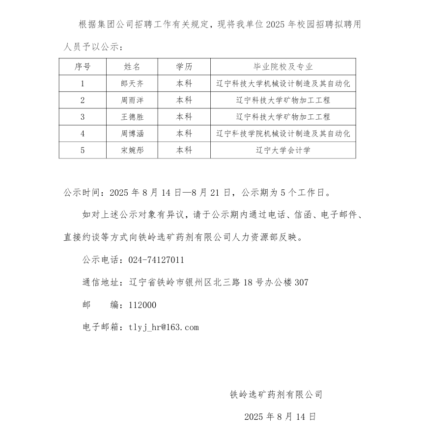鐵嶺選礦藥劑有限公司2025年校園招聘 擬聘用人員公示